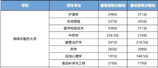 湖南中医药大学2023年专升本录取分数线中中药学专业最高254.5分,最低216分;应用心理学专业最高197分,最低148.5分。