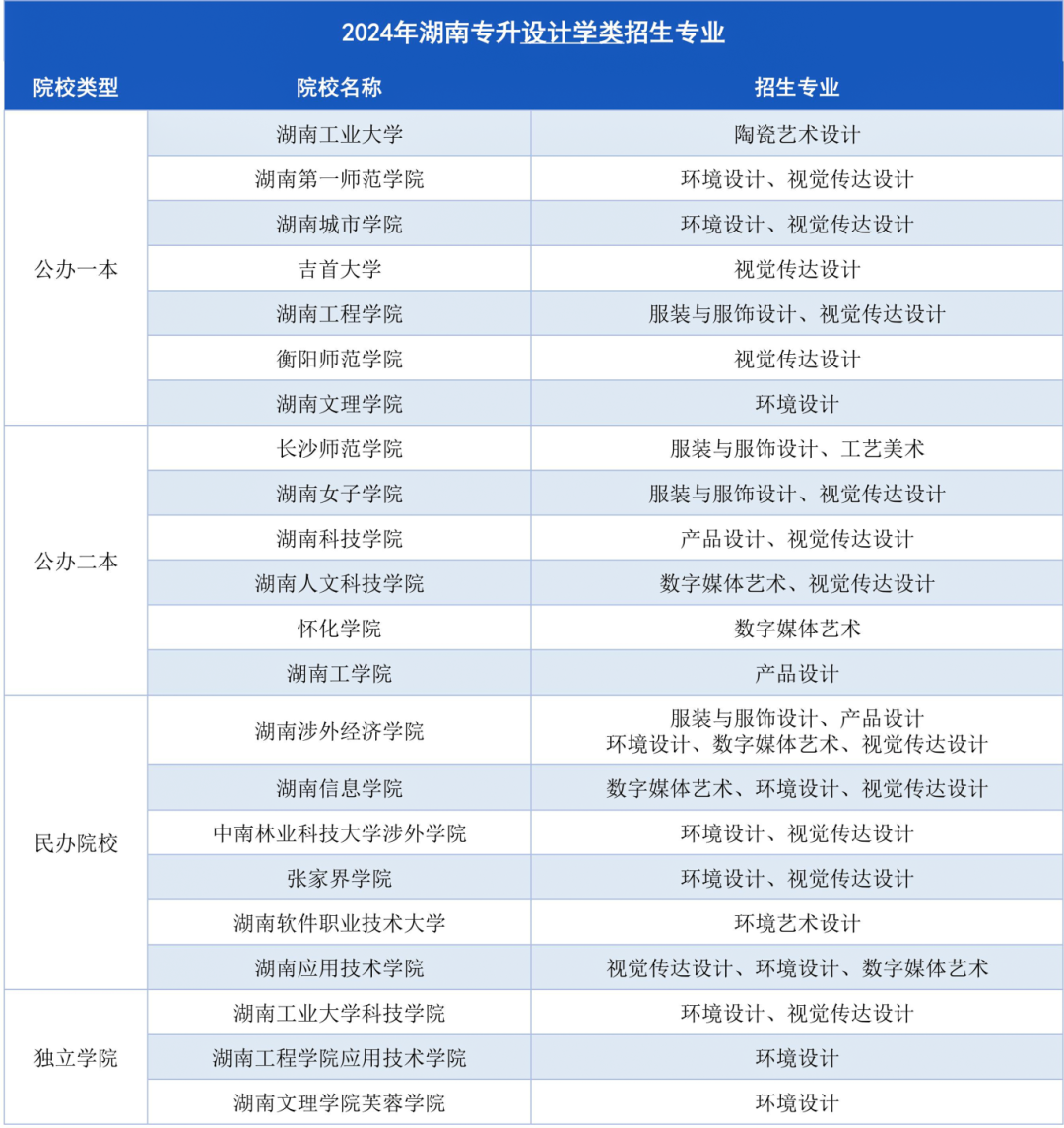 2024年湖南专升本共有13所公办院校、6所民办院校、3所独立学院招收设计学类的专业(7所公办+6所民办),以视觉传达设计专业为主要招生专业。